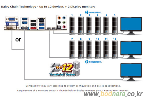 GA-Z77X-UD5 TH의 출력부에는 인텔 DSL3510L을 통해 최대 10Gbps의 데이터 전송속도를 제공하는 썬더볼트 포트 2개가 구비되어 있다. 각 포트에는 데이지 체인(Daisy-Chain) 방식으로 최대 6개의 썬더볼트 장치와 Mini DisplayPort 인터페이스의 모니터 1개를 연결해 동시에 사용하는 것이 가능하다.