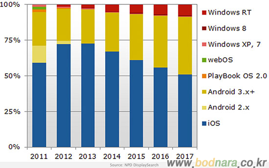 이에 비해 구글 안드로이드는 2012년 22.5%에서 2017년이 되면 40.5%까지 상승할 것이며, 마이크로소프트 윈도우 RT역시 2012년도에는 1.5%에 불과하겠지만 2017년이되면 7.5%까지 상승하면서 경쟁의 한축을 마련할 것으로 전망하고 있다. 결국 지금까지 지속되어왔던 애플의 독주체제가 구글 및 MS등과의 경쟁으로 인해 어느정도는 무너질 것으로 기대되고 있다.