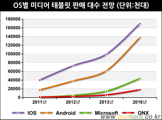 이렇듯 태블릿PC 시장의 부흥을 이끈 아이패드의 시장 출시 이후 전체 태블릿PC 시장은 꾸준한 성장세를 보였다. 전세게 태블릿PC 판매량의 경우 2010년에는 1,761만대였던 것이 2011년에는 6,001만대, 그리고 2012년에는 1억 1,888만대(예상)등 높은 판매량을 보이고 있으며 2016년에는 무려 3억 6천만대까지 판매가 증가할 것으로 예상하고 있다.