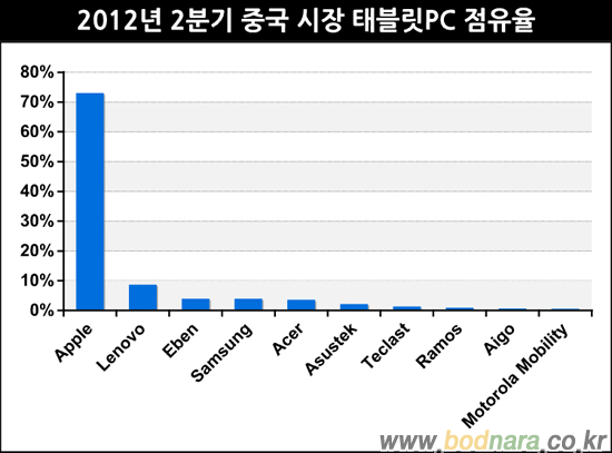 특히 최대 규모의 시장이라고 할 수 있는 중국 태블릿PC 시장의 경우 올 2분기에 애플 아이패드가 총 234만대를 판매해 72.6%를 점유하면서 독보적인 위치를 차지하고 있다. 이는 지난 분기보다 7.8% 상승하였으며 지난해와 비교하면 63.4%가 증가한 수치로 그에 비해 레노보, 삼성의 태블릿PC의 시장 점유율은 각각 8.3%, 3.6% 수준에 머물고 있다.