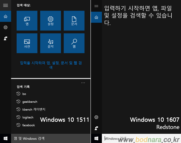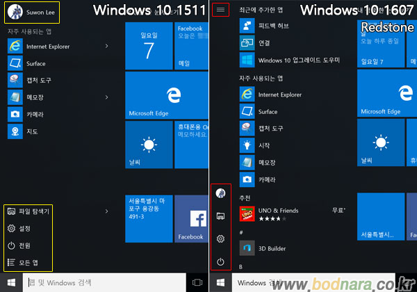 좀더 자세히 비교해보면 윈도우 10 1511 버전까지는 시작화면에 사용자 계정, 파일 탐색기, 설정, 전원, 앱 리스트 등이 자리를