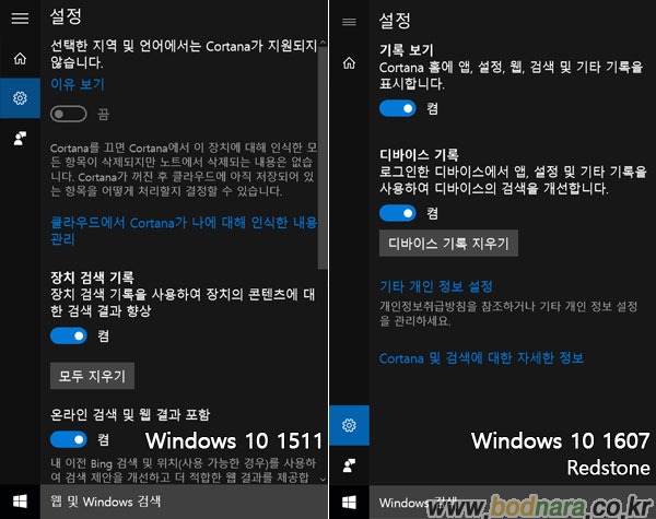 기능 옵션을 빼고 '기록 보기'라는 좀더 부드러운 문구로 바꿔놓았다. 물론 이 옵션이 활성화되었다고 해서 실제로 코타나를 국내 윈도우 10