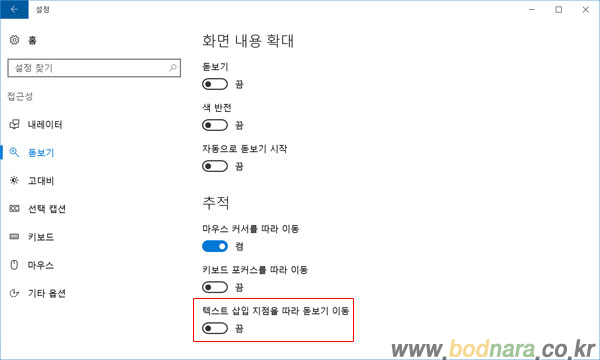 접근성 설정은 돋보기 항목의 추적 메뉴에 텍스트 삽입 지점을 따라 돋보기 이동 옵션이 추가되었다. 그 외에 다른 항목들은 기존 윈도우 10