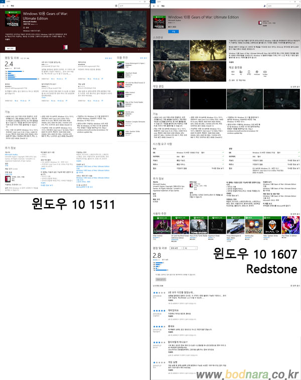실제로 1주년 업데이트 후 윈도우 스토어에 있는 게임(윈도우 10용 기어즈 오브 워 얼티밋 에디션) 정보를 비교해보면 제공 플랫폼, 시스템