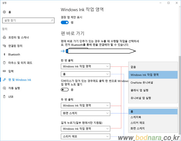 윈도우 10 설정 에서 장치 항목으로 들어가 펜 및 윈도우 잉크에서 관련 옵션들을 바꿀 수 있다. 별도의 블루투스 버튼이 들어간 서피스 펜